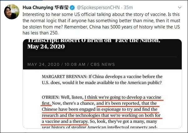 对此,5月25日晚间,外交部发言人华春莹在其推特上转发了相关报道,并且无比犀利地回应道:“听一些美国官员谈论疫苗的故事,真是有意思。如果有人有比我的东西更好,那一定是从我这里偷走的,这是正常的逻辑吗?记住,中国有5000年的历史,而美国的历史不到250年。”(注:美国1776年签署《独立宣言》)
