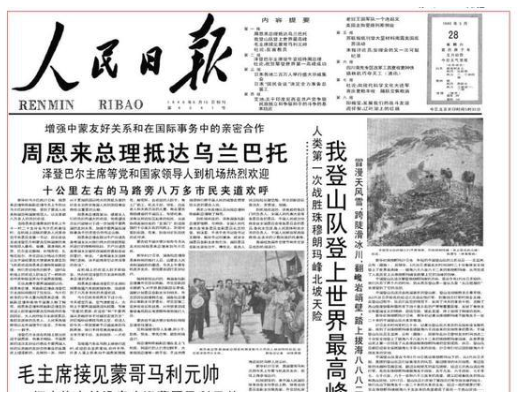 1960年5月28日,《人民日报》头版以《人类第一次战胜珠穆朗玛峰北坡天险 我登山队登上世界最高峰》为题向全世界报道了中国登山队成功登顶珠峰的新闻。
