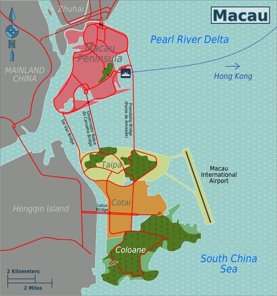 ▲从上到下依次为:澳门(澳门半岛)、氹仔、路环三部分。也有所谓的第四部分路氹,即氹仔岛和路环岛之间的围海新土地