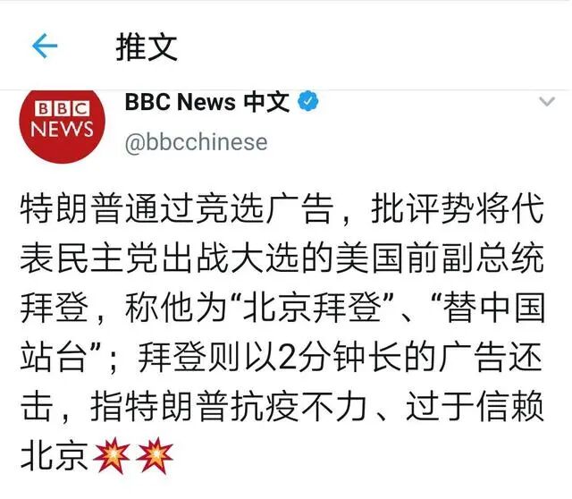 虽然拜登也可以同样指责特朗普对中国软弱,但是底气不足。因为四年前民主党给特朗普量身定做的画像是“通俄”,现在说他是“莫斯科特朗普”明显不好使,说他是“北京特朗普”又不好转弯。当然这就是美国政坛特色。