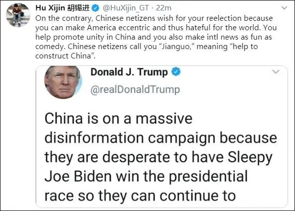 这个推特原本就是按照惯例在“北京拜登”的肖像上再描上一笔,但这个时候环球时报主编胡锡进出来,转发特朗普的推特:“相反,中国网友真心希望你连任,因为你让美国变得古怪、被世界讨厌。你帮助中国团结起来,并凭一己之力让国际新闻变得像喜剧一样好玩儿。中国网友称你为‘建国(Jianguo)’,意思是‘帮助建设中国’。”