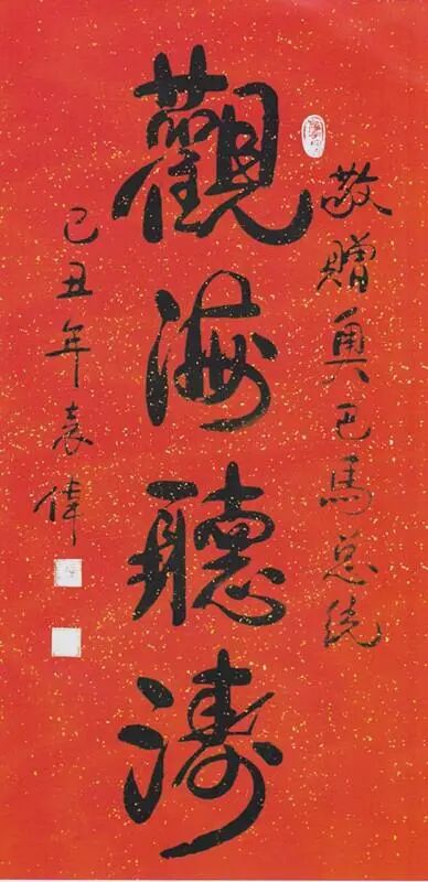当时中国军事博物馆等机构主办了一个仪式:百名开国将军接受“金玉虎符”,奥巴马也获赠了同样的礼物。美国驻华大使看到由著名红色书法家袁伟将军题写的《金玉虎符》国礼后,觉得很有东方味道,邀请他为奥巴马个人写一幅书法作品。