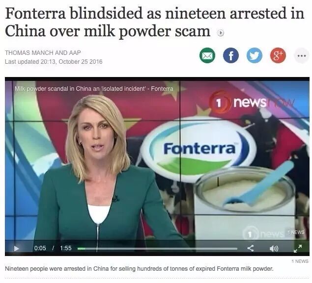 2016年,近300吨新西兰过期奶粉流入中国,19人名涉案人员在中国被拘捕。