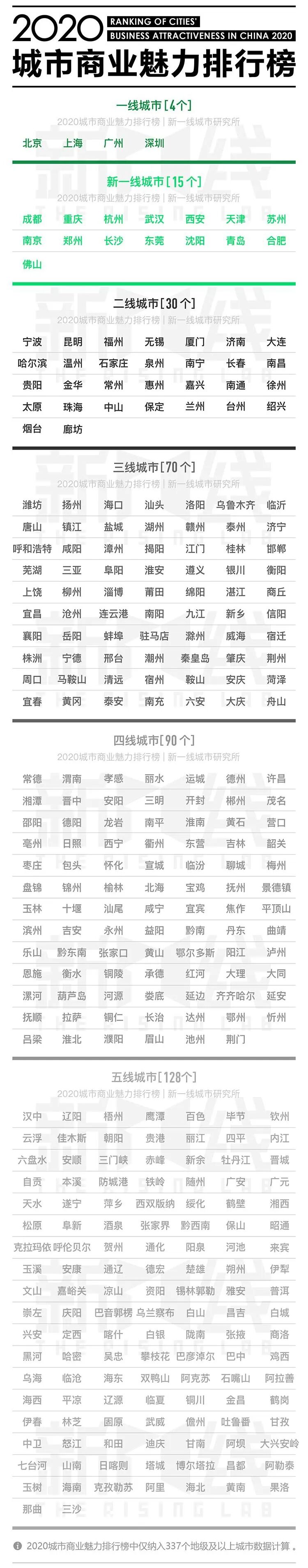 337个城市,分为4个一线城市、15个新一线城市、30个二线城市、70个三线城市、90个四线城市、128个五线城市。