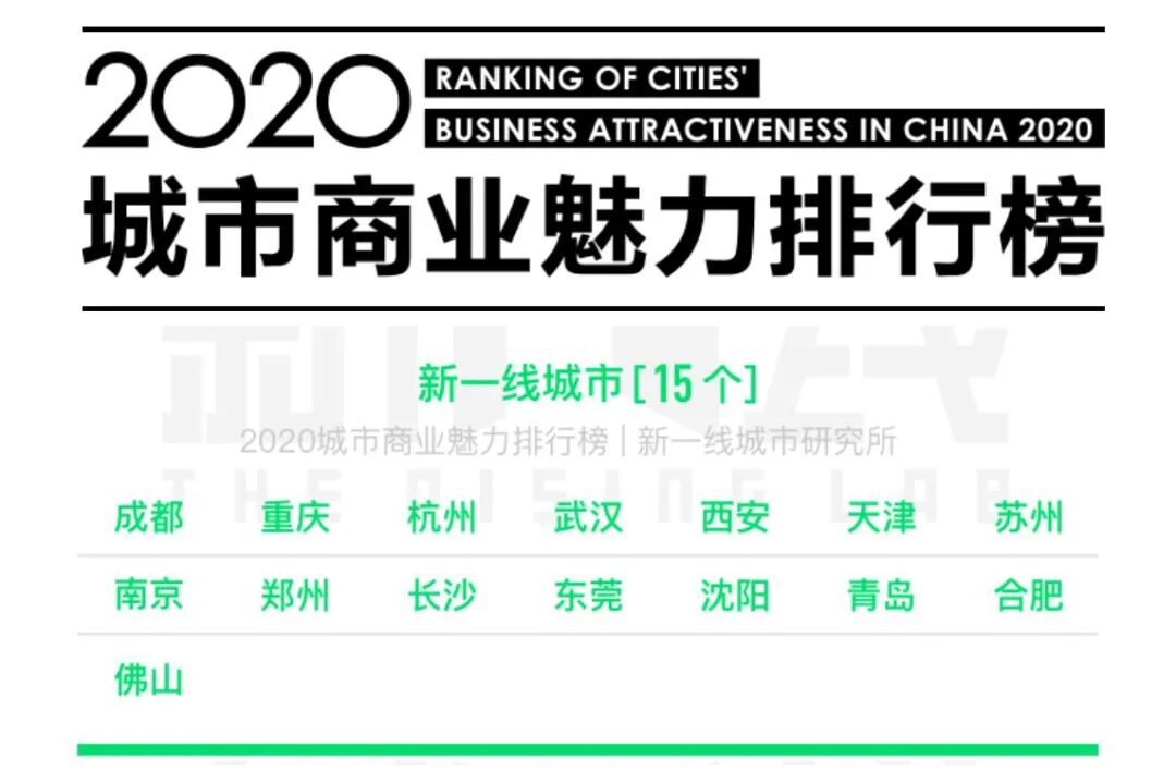 2020年版的15个新一线城市:成都、重庆、杭州、武汉、西安、天津、苏州、南京、郑州、长沙、东莞、沈阳、青岛、合肥、佛山。