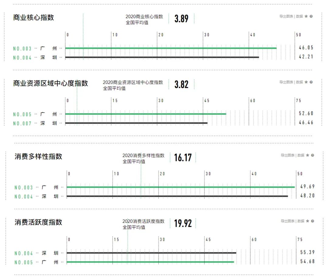 无论是商业资源实力,还是消费多样性、活跃度上,广州都多少领先于深圳。因此,在这份榜单上,一线城市还是按照北上广深的位次排序。
