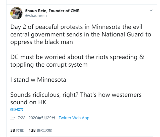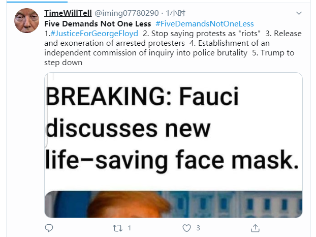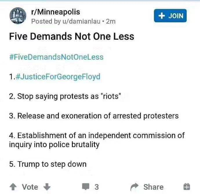 今天最好笑的事情是,当你现在在twitter上以“five demands not one less”(五大诉求少一不可)去搜索时,最顶部出现的不再是香港相关的事情,而是美国明尼阿波利斯: