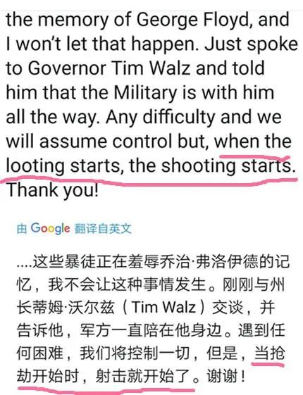 为了表达强硬,关键时刻特朗普发推表示,“当抢劫开始时,射击就开始了”。