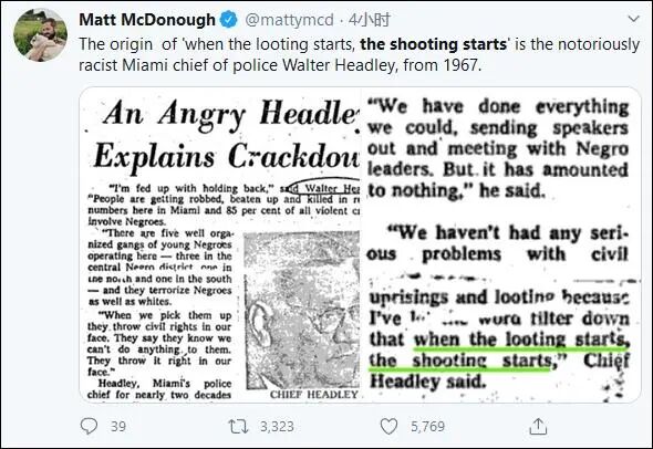 更为关键的是,“敢抢劫就开枪”这话也不是特朗普的原创,而是出自1967年的迈阿密警察局长沃尔特·黑德利之口。此人是一名臭名昭著的“种族主义者”,这句话就是他当时对非裔抗议者说的。