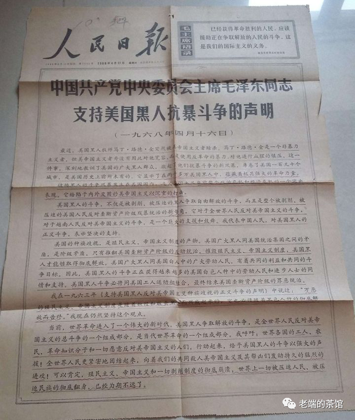 如果黑人的骚乱仅限于烧车加抢劫,那就是一群乌合之众,绝对不会有任何前途,此时此刻黑人兄弟最需要的是理论武器,那就是毛泽东思想!在上世纪60年代,黑人运动风起潮涌,毛泽东同志为美国黑人写过两篇文章,分别是1963年8月8日《支持美国黑人反对种族歧视的斗争》和1968年4月16日的《中国共产党中央委员会主席毛泽东同志支持美国黑人斗争的声明》。