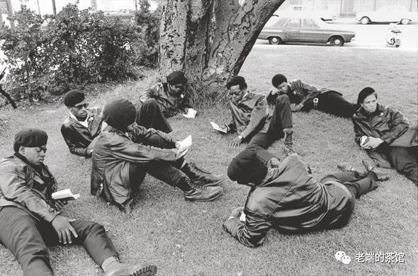 美国黑人还成立了一个黑豹党,下图是黑豹党成员一人一本红宝书,躺在草地上摆拍的照片。