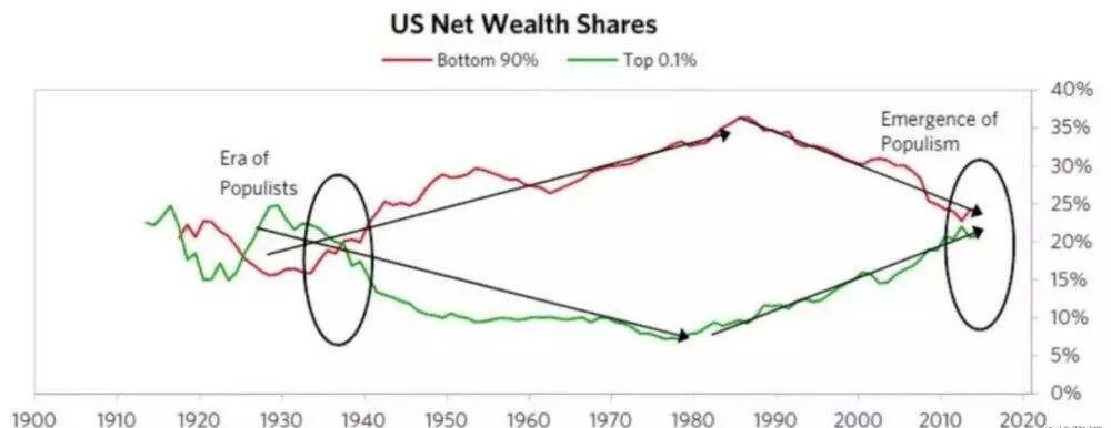 大萧条后,美国实施福利政策,加大转移支付,贫富差距逐渐缩小。但是,从80年代开始,投资银行及跨国公司崛起,金融资产持续膨胀,贫富差距持续扩大。如今美国贫富差距日渐接近大萧条前期的峰值。