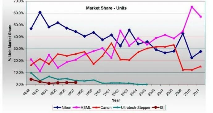 两千年初踏错了干刻湿刻的选择之前,其实早于1997年,在美国政府一手干预下,尼康被EUV LLC排挤在外时,就已经注定了如今光刻机市场一家独大的结局。