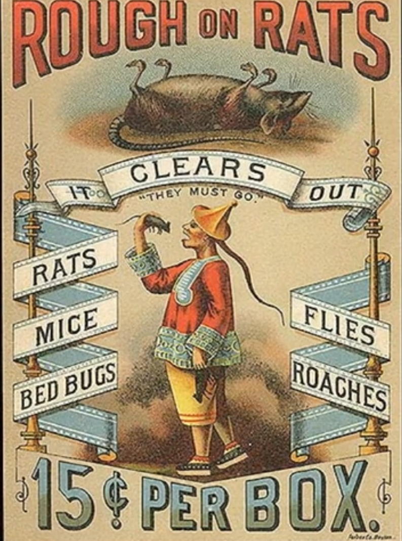 这是《纽约时报》当年登出的老鼠药广告,在“清除”这个字下面,小的字写着“一定要赶走它们”,显然这里面指的可不仅仅是老鼠,也包括中国人。