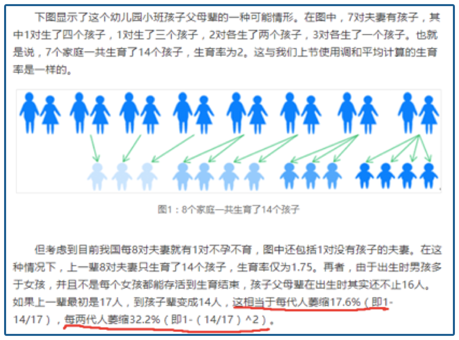 可能觉得大家都不积极响应号召,他专门用数学公式苦口婆心地说,就算有少数家庭生三个四个,人口依旧是萎缩的: