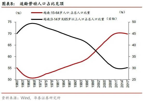 越南的人口数量红利仍在存在,但是已经出现拐点。适龄劳动人口占总人口比重在2012年前后出现下降趋势,抚养比也在2012年前后开始上升。