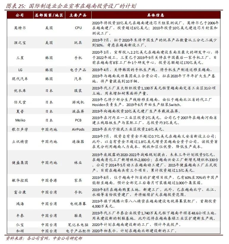近两年宣布在越南投资建厂的企业不在少数,如下表所示,国家涉及美日韩以及中国,行业涉及芯片、屏幕等高科技产品,也涉及纺织、鞋业等中低端产品。