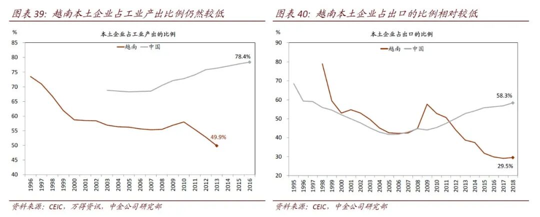 2013年越南本土企业占工业产出比例低至49.9%,近年来大量外资设厂,比例显然在进一步降低。越南本土企业占出口的比例表现愈发明显,2018年已经达到了过去20年的最低点,2018年仅为29.5%。中国本土企业力量则在2006年达到最低点以后一步步抬升。