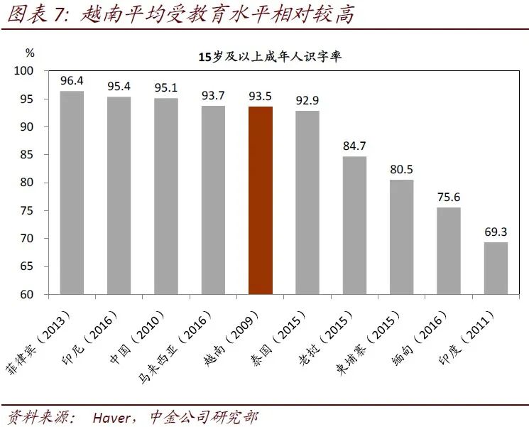 从人口质量看,越南平均受教育水平相对较高,15岁及以上成人识字率达到93.5%,虽然次于菲律宾、印尼、中国和马来西亚,但是差距比较微弱。而且越南科教文卫投资增速较快,人口质量红利未来还有较大发展空间。