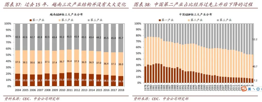 众多相似之外,两国在许多方面同样存在较大差异。具体看中越两国的产业结构可以发现一个有趣的现象:中国从2000年以来二产、三产比例变化明显,尤其是第三产业一直保持增长,但越南三大产业的结构并没有发生太大变化,尤其二、三产业的比重,表现出惊人的稳定性。这是为何?