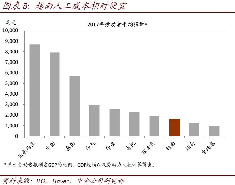 劳动力成本优势更是明显,越南人均GDP虽然逐年增长,但是同其他东南亚国家相比仍处于低水平,尤其相较于马来西亚、中国和泰国6000至9000美元的人工成本,越南不到2000美元的人工显得尤其便宜。