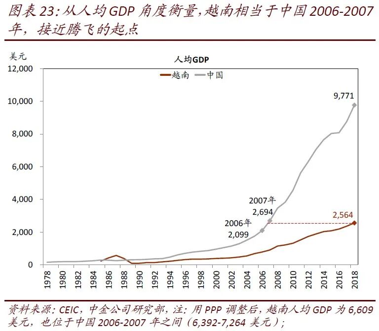 从数据上看,2018年越南人均GDP为2564美元,处于中国2007年前后的水平;2018年城镇化率为35.7%,仅是中国2000年前后的水平;2018年房地产投资占GDP比重仅为2.4%,中国早在1997年该比例就达到了5%;2014年越南人均耗电量为1424千瓦时,接近中国2003年的用电水平。