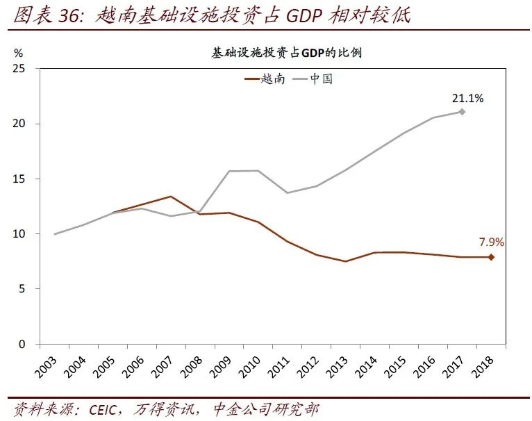 除了产业结构不同,越南在部分环节表现上也与中国走出了趋势性的差距。从基础设施投资占GDP比重可以看出,随着时间推移,中越从2008年前后的相似水平走向两个方向,中国持续攀升至21.1%,而越南一路下降到7.9%。今日越南落后的基础设施建设状态,是越南亟需补齐的一大短板。