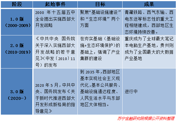 从发展规划的角度,“西部大开发战略”以十年为一个阶段持续演进,已经经历了1.0版和2.0版,2020年5月,中共中央、国务院发布《关于新时代推进西部大开发形成新格局的指导意见》,标志着西部大开发战略迈入第三个阶段。具体来说,“西部大开发战略”三阶段发展状况如下表: