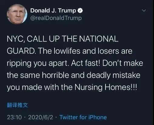 6月2日,美国总统特朗普发表推特称“纽约市,呼叫国民警卫队吧,那些低等生命和失败者正在撕裂你。”过去的美国总统无论有着多么深的种族歧视思想都不会这么赤裸裸地宣称那些抗议示威者为低待生命和失败者,他们至少还要披上一层羊皮,还要裹上一件 “人人生而平等”的外衣,现在,特朗普这个白人至上主义者公然宣称那些被白人歧视的种族为低等生命和失败者,表现出他对其他种族是何等的蔑视。如果说此前他关于将消毒剂注射进人体可以杀死病毒的言论只能算愚蠢的话,那么现在他作为美国总统称自己国家的一部分国民为低等生命和失败者,简直就是一种不折不扣的恶毒,这与当年西方人在公园门口挂上“华人与狗不得入内”的牌子、日本人称中国人为“支那人”有着相同的用意。