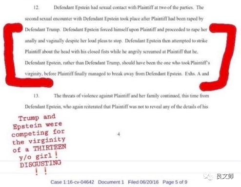 1994年,纽约的秋天有些萧瑟,晚风中透着凉意,13岁的简·多伊不由打了一个寒颤。她站在一处商店橱窗外,看着橱窗里自己的镜像,她长得非常好看,虽然只有13岁,但已经发育得楚楚动人。这里是曼哈顿,是全纽约最富有的区,旁边就是蜚声全球的第五大道,再往前几百米,就是她今晚的目的地,一位亿万富豪的私人豪宅。这不是多伊第一次来这里,这座占地50000平方英尺(4600㎡)的豪宅里经常举行一些不同寻常的Party,各种身材性感、穿着暴露的女人往来此地,其中许多都是未成年人。这所豪宅的主人,对未成年女性有着近乎痴狂的特殊癖好。想起现场混乱不堪的场面,多伊有些打退堂鼓,但想到可以获得的数百美金的酬劳,以及“会帮助她实现模特生涯”的承诺,她用力咬了咬涂着鲜艳口红的嘴唇,终于下定了决心。“只不过就是一场Party”,多伊在心里安慰自己。此前,她已经参加过三次,虽然场面极其不堪,但她个人并没有发生危险,所以这次她抱着侥幸心理,再次走进了豪宅的大门。这位客人身高1米90,体型十分强壮,他是此间主人的多年好友,与其极为熟络。容貌清丽、身材纤细的小女孩儿多伊成了他眼中最鲜美的猎物,他的目光贪婪地在多伊身上不断打量,然后频繁地跟此间主人交头接耳,提出了他的要求。出乎他意料的是,向来慷慨的豪宅主人这次竟没有如往常一般痛快地答应他,而是跟他竞争了起来。最终壮汉客人赢了,多伊被他拖进屋子,惊恐地看着他用绳子把自己捆绑在床上。多伊哀求他住手,但他狠狠地扇了多伊两记耳光,然后粗暴地跟她强行做了二人运动。很多年以后,多伊还记得他的表情,他的喘息,和他那满头金发。这位金发壮男就是特朗普,22年以后,他成了美国总统。川普没有使用任何安全措施,事后丢了一把钱给少女说:如果怀孕了就去堕掉吧。他还威胁多伊称:如果胆敢泄露任何他的性侵和虐待细节,她和她的家人将会有生命危险。考虑到川普斩首苏莱曼尼后恫吓伊朗说如果敢报复,就轰炸伊朗的历史古迹;以及躲在白宫地下掩体里,威胁如果示威人群冲进来,他就放狗等言论,他对多伊的这番恫吓,具有非常典型的川普风格。面对昔日的商界大佬,如今的美国总统,多伊曾一度申请了保护令,保护自己和家人免受被告的伤害和骚扰。时代的一粒尘,落在一个13岁小女孩的床上,就是一个1米90的美国总统。很多年以后,时代的另一粒尘,又落到了一个名叫弗洛伊德的黑人脖子上,变成了一条致命的警察大腿。如果是奥马巴或者克林顿遇上这种情况,一定会第一时间发表电视讲话,谴责肇事警察,扯起人权大旗哄一哄黑人,甚至挤出一两滴同情的眼泪,事情就圆满解决了。靠着煽动民粹、打种族主义大旗上台的懂王,岂能向黑人示弱?于是川普成功引火烧身,将抗议种族矛盾的这把火引向了自己。近日多年未曾露面的全球最大黑客组织“匿名者(Anonymous)”,再现江湖。正是该组织在社交媒体上,将特朗普当年强奸13岁少女的内幕爆了出来。根据黑客组织提供的法庭文件显示,这位化名简·多伊(Jane Doe)的少女控诉特朗普和爱泼斯坦对自己强奸、性虐待、殴打、胁迫、非法监禁和诽谤。早前特朗普就被曝光涉嫌多起强奸,但那些案件均已经达成庭外和解(砸钱)。他还曾被质疑(可能)有恋童倾向。一个强奸嫌疑人,经过自己的努力奋斗,不但成功脱罪,还最终当上了美国总统。同样励志的,还有那位豪宅主人,川普的好友、大富豪爱泼斯坦。去年,美国金融大亨爱泼斯坦在监狱中离奇“自杀”,曾引起举世哗然。爱泼斯坦出身贫贱,凭借投资天赋以及组织大量未成年少女从事性交易、为政客和富豪们提供性服务而跻身上流社会。年轻时的爱泼斯坦连大学都没上,却凭借着不凡的智商混进了纽约最负盛名的道尔顿私立贵族学校,教起了微积分(美国版罗永浩)。精明又很会“来事”的爱泼斯坦很快抱上了一位很有权势的学生家长大腿,就是投资银行贝尔斯登公司的董事长阿兰·格林伯格。阿兰把他招进了自己的公司,这是爱泼斯坦迈出的此后平步青云人生的第一步。发迹后的爱泼斯坦拥有一架私人波音727飞机,负责接待各路权贵往来他在世界各地的销魂窟。为了方便客人,他直接在飞机上提供服务,供权贵们“一日千里”。据飞机副驾驶员爆料,飞机上的空姐都是未成年人,她们穿得就像“脱衣舞娘”。美国前总统克林顿、现总统特朗普、以及英国安德鲁王子等顶级政界名流,都曾是这架飞机的乘客,其中克林顿更是乘坐达26次之多。在爱泼斯坦位于曼哈顿的豪宅大厅内(就是文首那栋),挂着一副克林顿的巨幅女装肖像:这幅画以白宫椭圆形办公室为背景,克林顿身穿跟当年性丑闻女主莱温斯基一样的蓝色连衣裙,以一个非常妖娆的姿势侧躺在椅子上,右手比出一个美军募兵宣传画标志性的“我要你”的手势。位于佛罗里达州的棕榈滩别墅;法国巴黎的豪华公寓;新墨西哥州斯坦利的一座占地10,000英亩的牧场,据说爱泼斯坦曾计划在该牧场内一次性让14名女性受孕,以延续他的“优秀基因”。但最令人震撼的,还是他那座位于美属维尔京群岛上的“小圣托马斯岛”私人岛屿,该岛后来被媒体命名为“萝莉岛”,又名“性奴岛”。据曾在岛上工作过的雏妓弗吉尼亚透露,岛上全是未成年少女,经常一丝不挂的在岛内活动,专门用来招待世界名流。爱泼斯坦猎获少女的惯用手段是以按摩为名义,诱