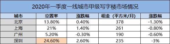 不过,火的另一边是冰:根据戴德梁行近期发布的报告显示,一季度甲级写字楼市场方面,北京、上海、深圳的空置率分别上升至13.8%、21.0%、24.6%,环比分别增加0.4、1.4、2.6个百分点。其中,上海和深圳创下空置率新高,北京则达到近十年来最高位。