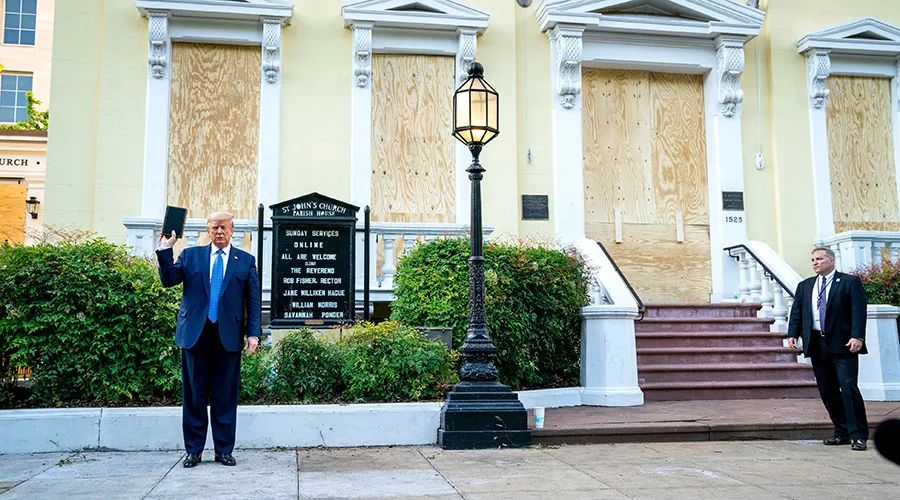 祈祷完走出教堂的时候,特朗普还站在教堂外面手举圣经拍了张照片,不知道想表达什么,大概是他对上帝的重视吧。在这个特殊的时刻,一个基督教国家看到总统和第一夫人在教堂里祈祷,那画面或许会产生一种神秘的力量,让某些人看在上帝的面子上停止抗议。
