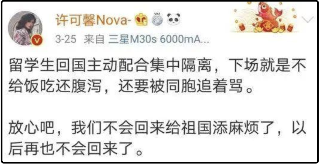 最近的“许可馨事件”的主人公许可馨也是一个典型的例子。很多人说许可馨是“留学巨婴”,其实不然,在疫情期间其言行中对民族的贬低、对祖国的攻击、对同胞的羞辱以及蓄意挑拨海外留学生和祖国情感的行为,是明显带有“精美”和“恨国”成分的。