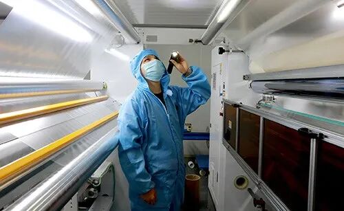 2020年4月20日,四川广安华蓥山经济技术开发区一家高分子材料企业,工人在检查用于医用测试仪器的原材料质量。