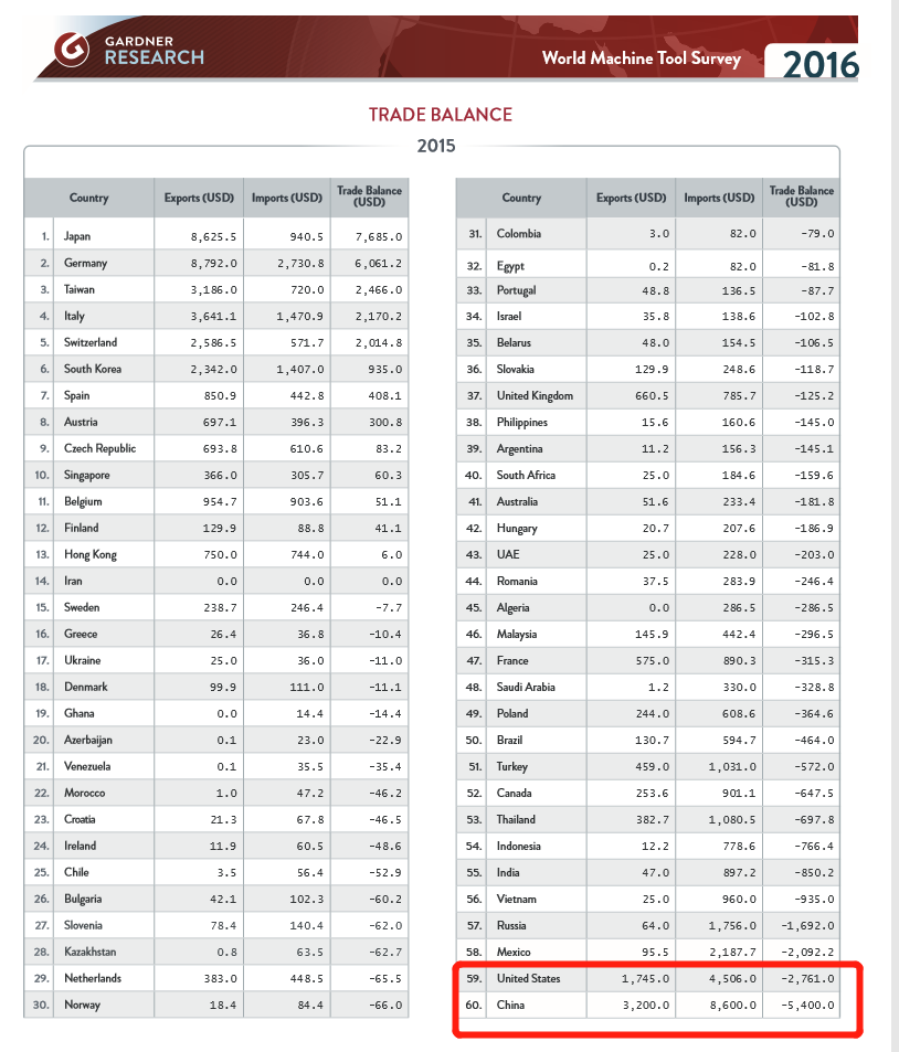根据Gartner的报告,全球第一大和第二大经济体,机床消耗量分别是第二和第一。然而具有讽刺意味的是,全球头60名进出口差额中,机床贸易逆差,中国和美国分别名列倒数第一和第二。