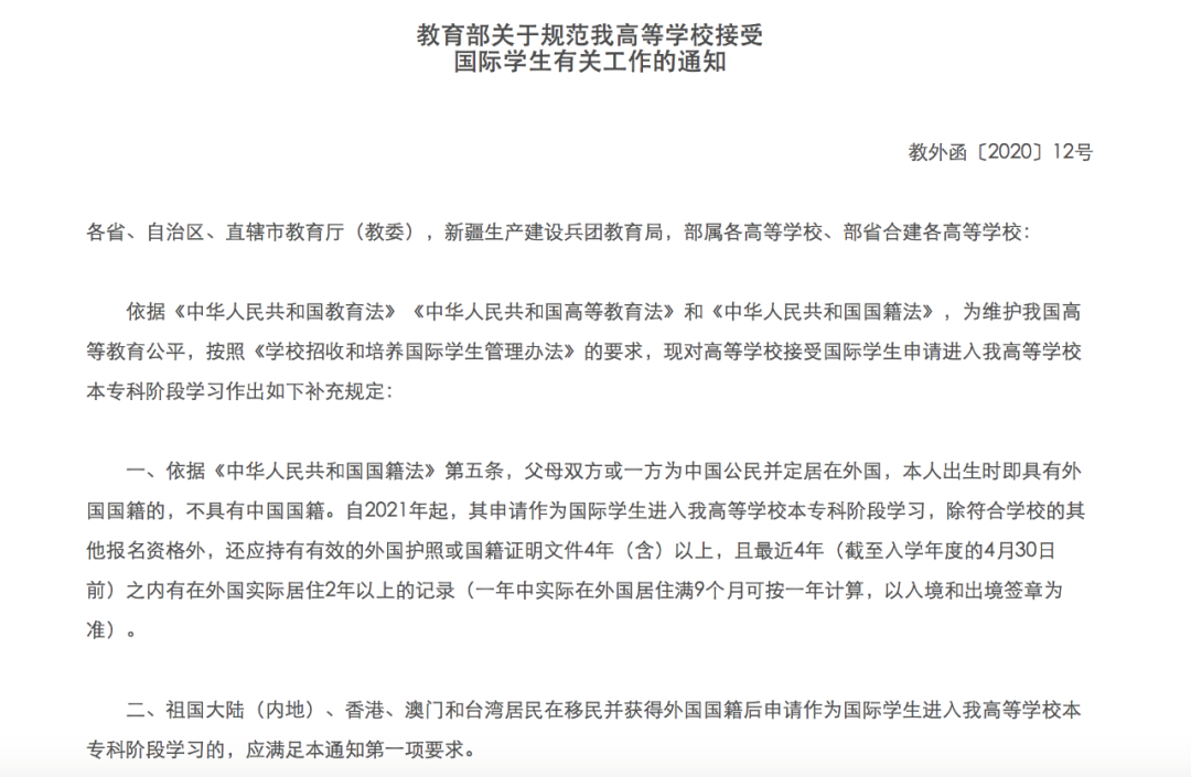 6月10日,教育部发布《关于规范我高等学校接受国际学生有关工作的通知》,其中的一条新规,引起了广泛关注: