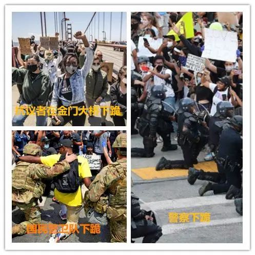 不仅抗议者下跪,连维持秩序的警察和军队也跟着下跪。大家不禁纳闷,老美的国家机器什么时候如此软弱了?要知道美国历史上,军队和警察,那都是赤裸裸的国家暴力工具。