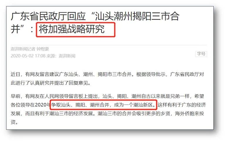 至于汕头,潮汕地区一直在谋求合并之路,日前有网友关于““汕头、揭阳、潮州合并,成为一个潮汕新区”的建议获得省民政部门回复,表示将加强行政区划战略研究。