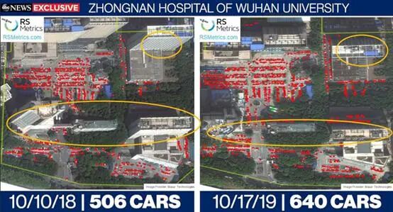 首先,哈佛大学的研究团队用2018年10月和2019年10月的卫星航拍照片做对比,发现武汉几家大医院门口2019年10月前面所停的车辆人流要多于2018年10月。这也是最主要的证据。
