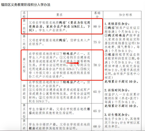 福田区义务教育阶段采取的是积分入学法,例如,父母在学校报名地段购房(要求为住宅用途商品房,家庭合法产权在51%以上)且学生入户在该房产,记为第一类,基础分为80分。