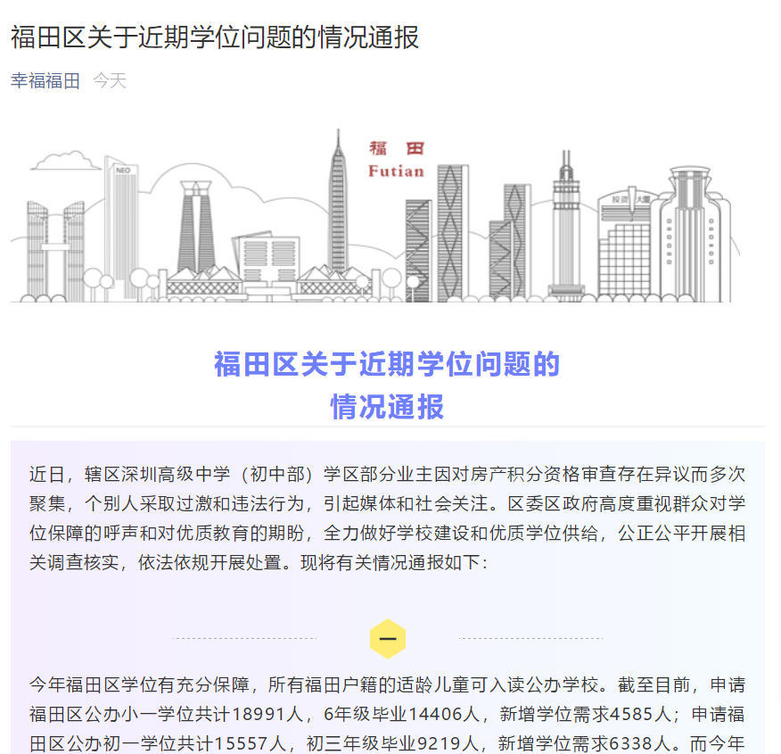 福田区说自己的学位有充分的保障,例如,今年福田区通过学校新改扩建等措施新增学位约2万个,完全能满足辖区义务教育学位需求。