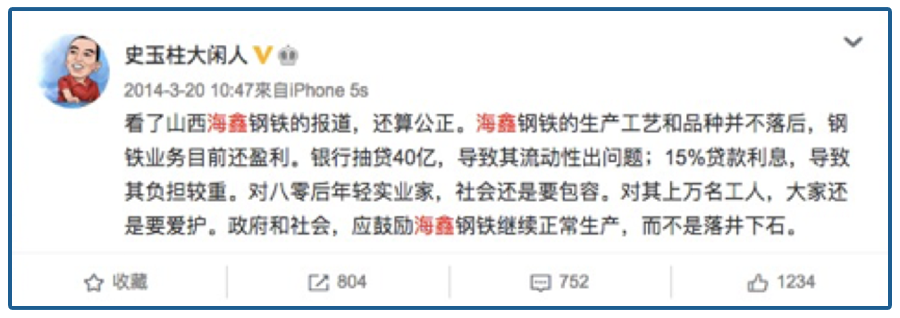 史玉柱对李兆会的印象不错,在海鑫债务危机爆发后,史玉柱还发微博力挺李兆会,呼吁“社会要包容80后年轻实业家”,甚至直指“银行抽贷40亿,导致流动性出问题”。