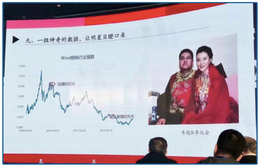 不过,这段婚姻也没有维持太久,就以分手收场,虽然车晓否认了3亿分手费的传闻,但是对于前夫的评价一直是赞誉有加,连市场分析师都列了数据,李兆会车晓在结婚时,wind钢铁行业指数还在3500以上,而到了离婚时的2012年,已经跌至2000以下。