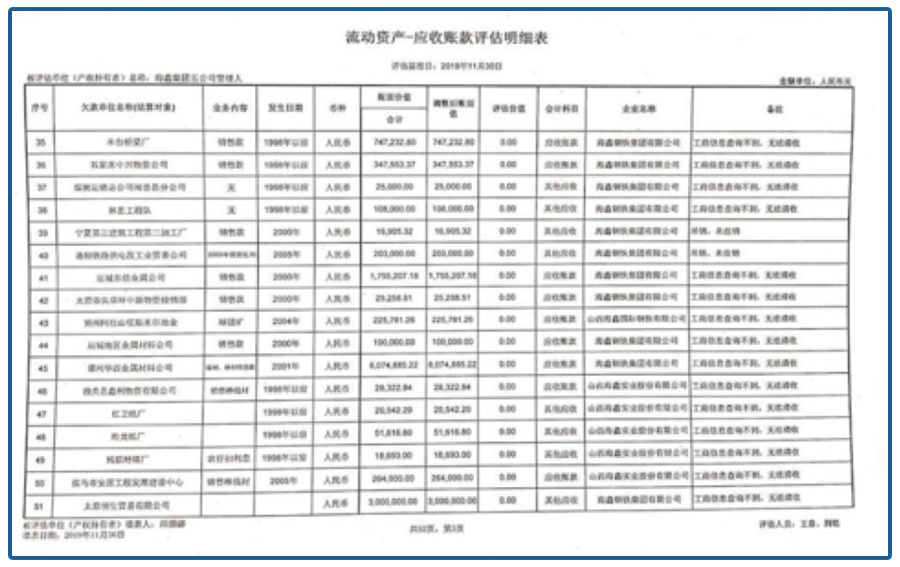 欠款的单位不是“工商信息查询不到”,就是已经注销,最近的债权都是2005年,距今已经15年了,还上哪儿去收钱呢,收不回来,价值约等于0。