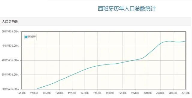 美洲拉丁人主要是西班牙后裔,我特意寻找了西班牙的人口变化图: