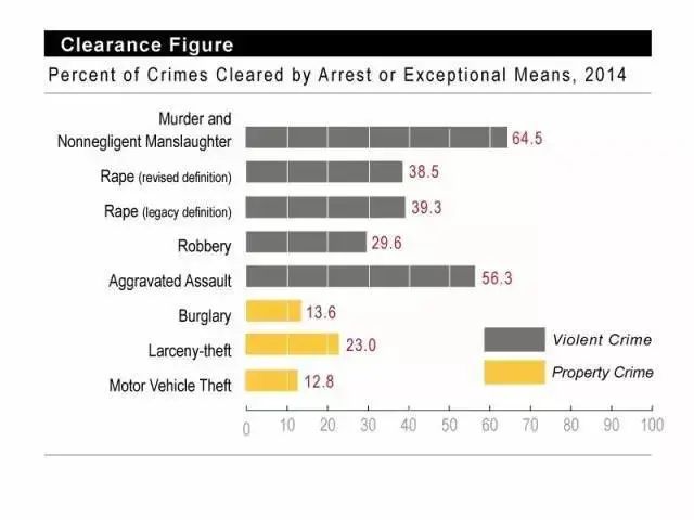 在过去的十年中,美国警察破案率大致稳定,所以截取中间那年大家有个概念就行了(2014年数据):