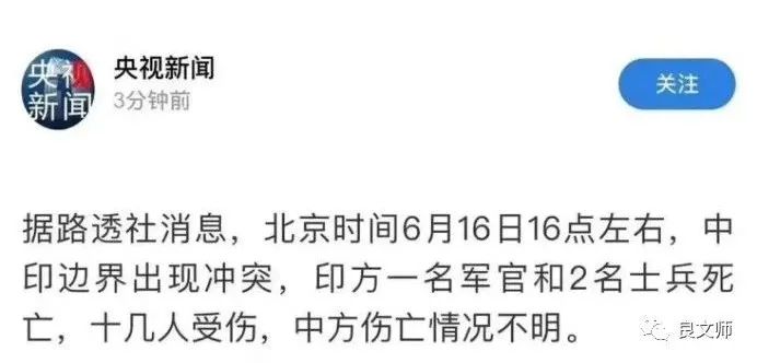 6月15日晚,在中印边境加勒万河谷地区,印军违背承诺,再次越过实控线非法活动。 蓄意发动挑衅攻击,引发双方激烈肢体冲突,造成人员伤亡。 加勒万河谷地区主权历来属我。 印边防部队出尔反尔,严重违反两国有关边境问题协定协议。 严重违反中印军长级会谈共识,严重损害两军关系和两国人民感情。 我们要求印方严格约束一线部队,立即停止一切侵权挑衅行动。 与中方相向而行,回到对话会谈解决分歧的正确轨道上来。