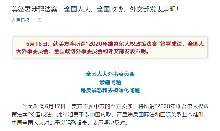 年维吾尔人权政策法案”签署成法