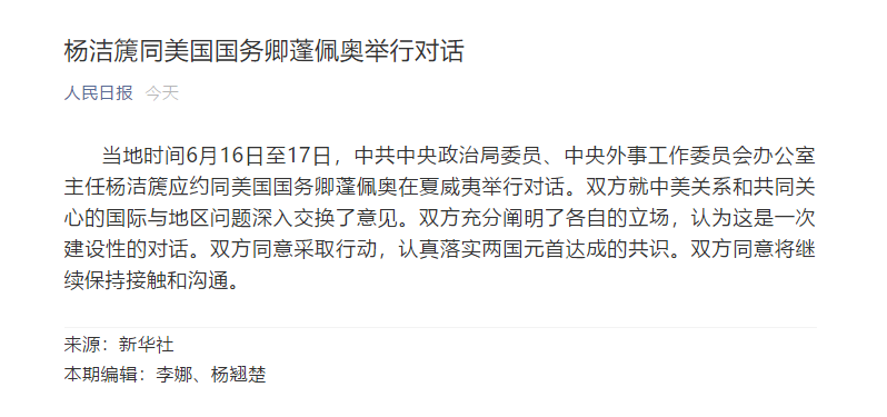 6月18日,历经两天的中美双方夏威夷对话结果出来了。
