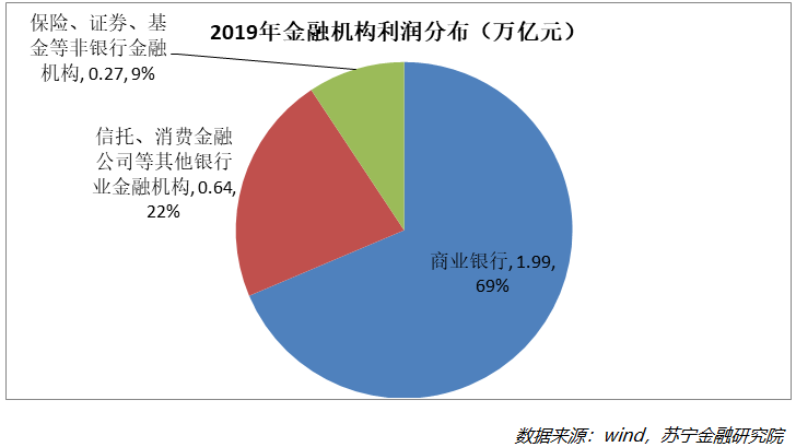 2019年,中国金融业税后利润约为2.9万亿元(测算过程为:银保监会的金融业税后利润数据更新至2017年,为2.43万亿元,2017-2019年北京金融业净利润增速为19.5%,假定全国也是这个增速,得出2.43×(1+19.5%)=2.9万亿),其中,银行业金融机构约为2.63万亿元,非银行业金融机构约为0.27万亿元。具体如下: